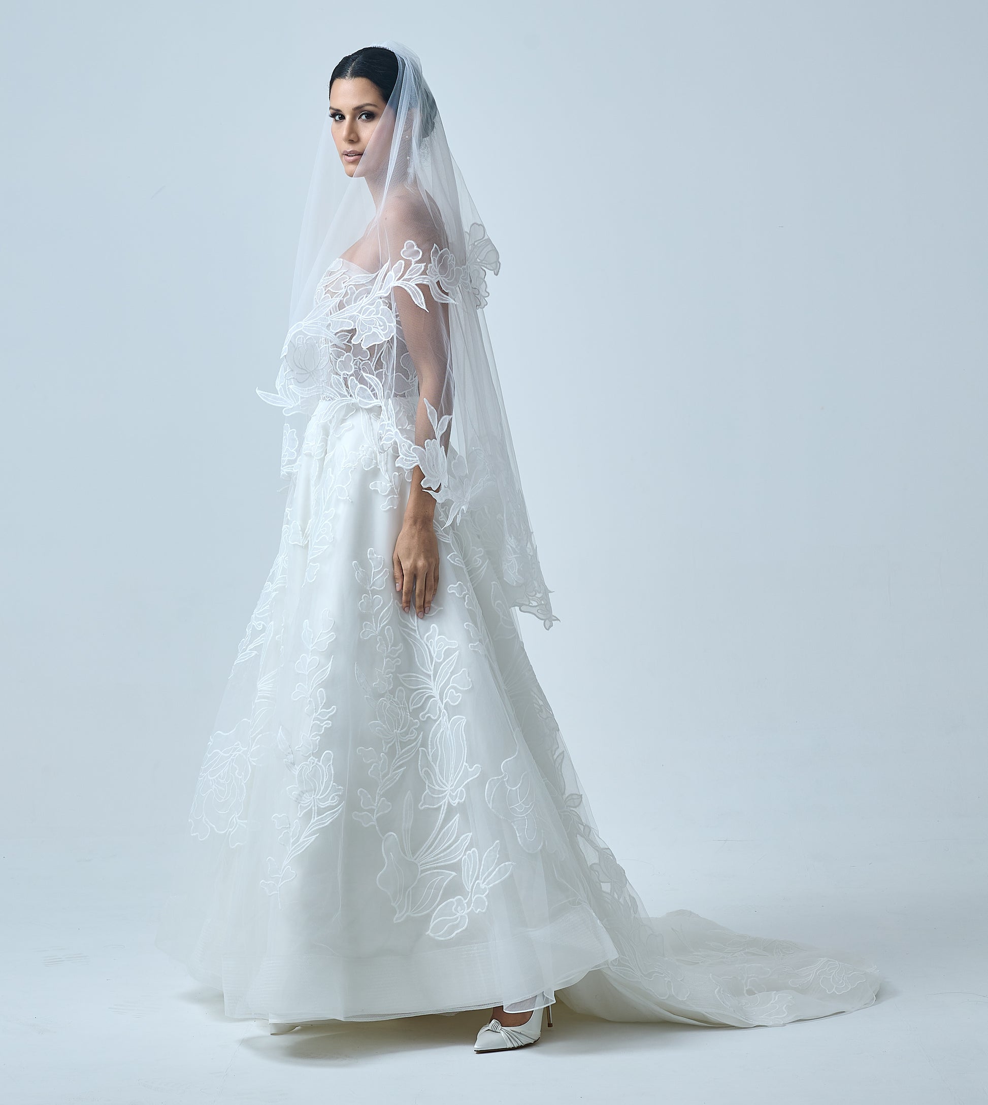 The Camellia Veil is a beautiful and timeless piece, featuring delicate organza flowers along the border to create a soft, romantic finish. Designed to complement Our Camellia gown and  a range of bridal styles, this veil adds subtle texture and elegance to your overall look.