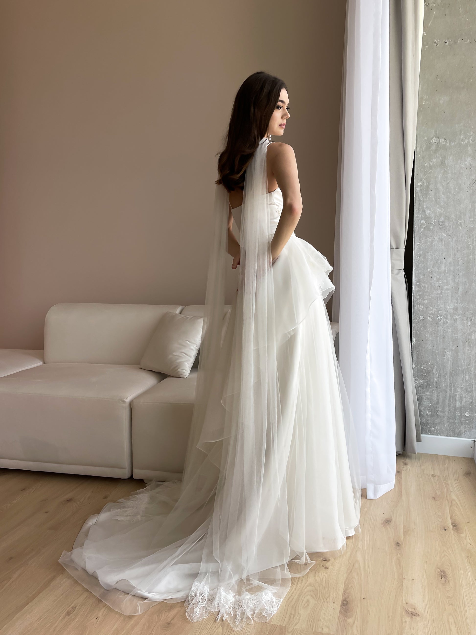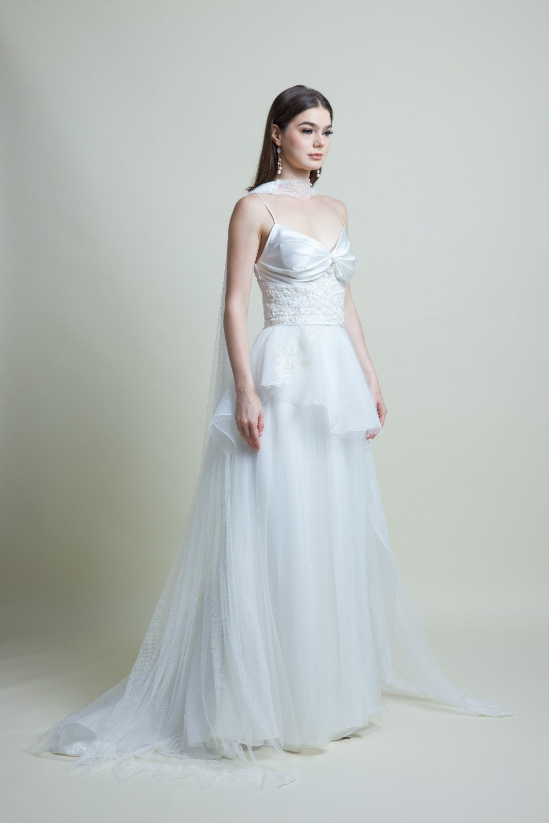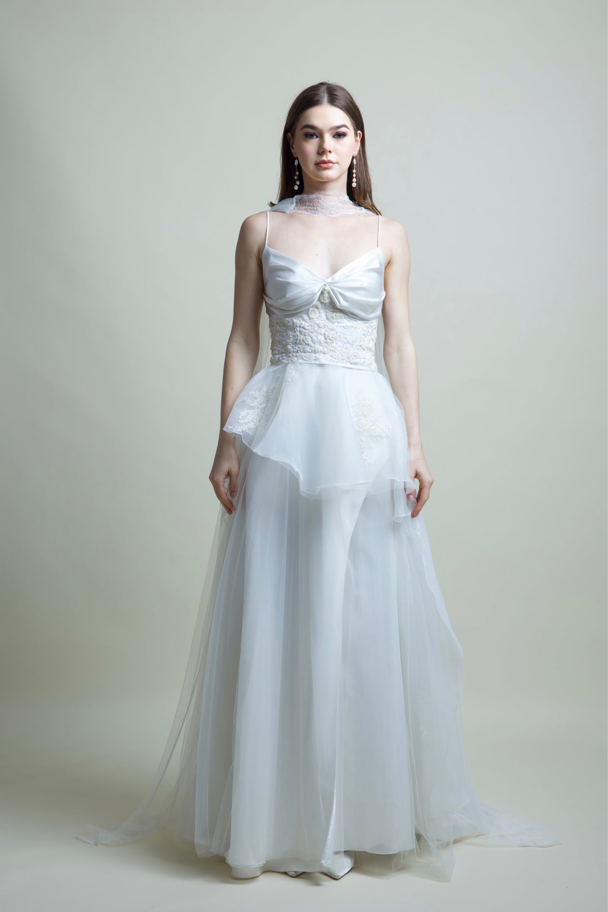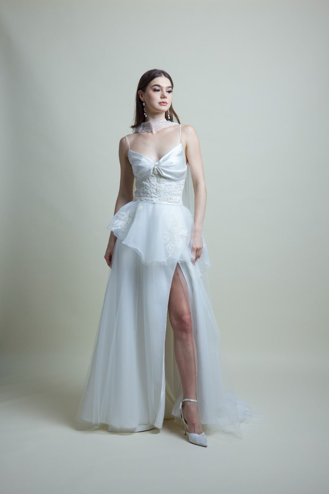 A playful slit skirt made of  tulle with layers of organza and satin to provide fullness and a whimsical feel. The combination of different fabrics creates a lovely texture and adds a touch of luxury to the outfit.