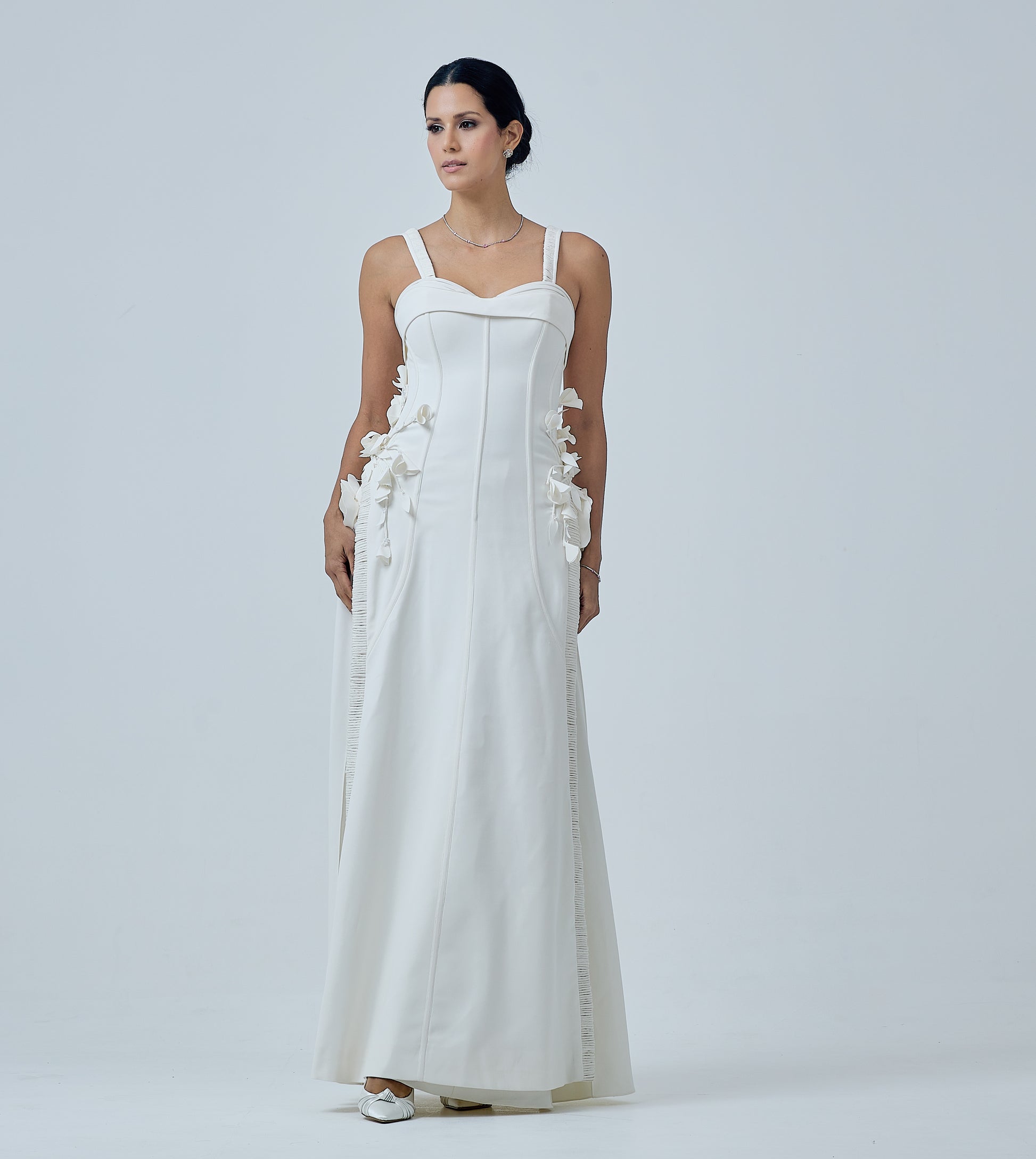 This exquisite body-hugging bridal tunic, featuring an integrated corset and alluring double slits, is a harmonious blend of contemporary design and ethical craftsmanship. 'Fleur' is meticulously crafted from premium stretchable crepe and corded with silk linen strings.