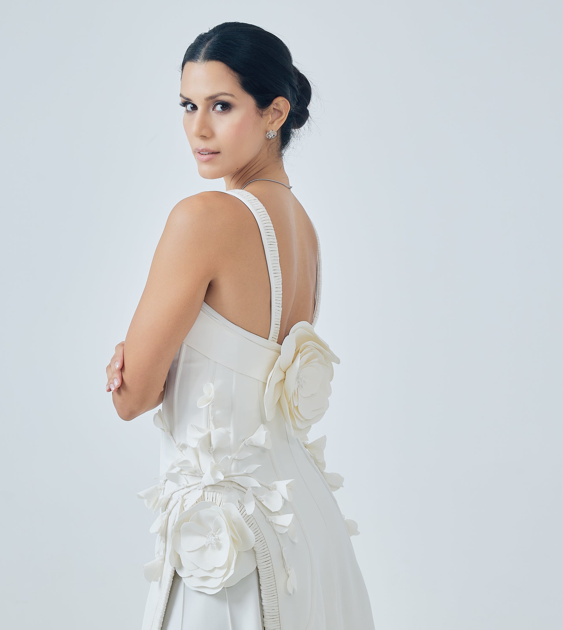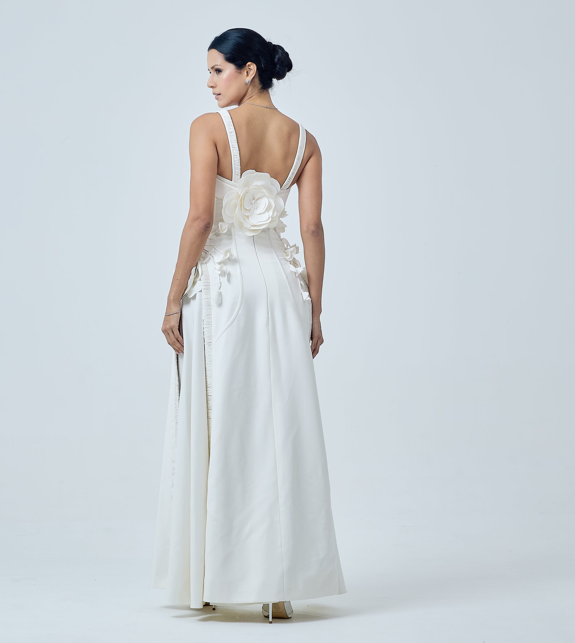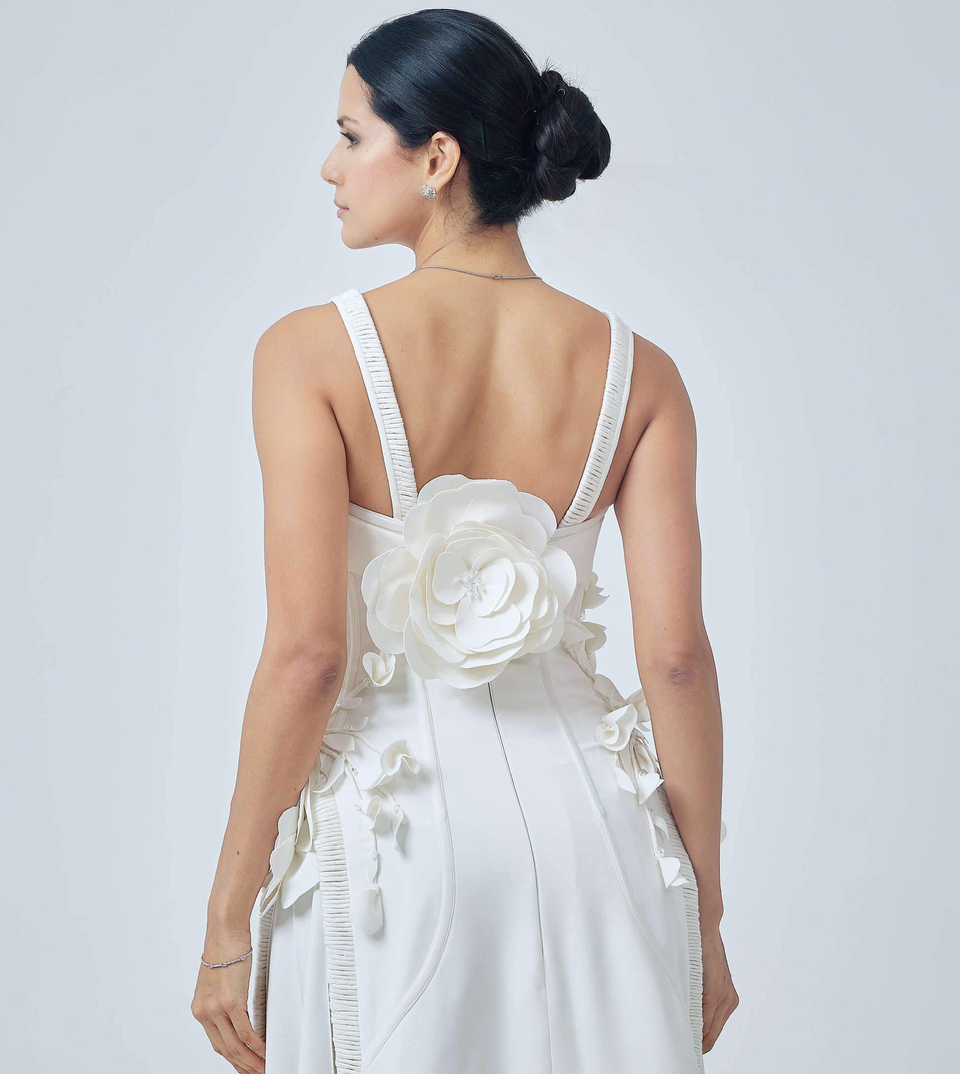 The true artistry lies in its delicate details: intricately embossed fabric flowers, meticulously hand-embellished with dazzling crystals and beads, create an ethereal "modern floral magic" aesthetic. This unique design offers a minimalistic yet impactful statement, perfect for the bride who desires elegance with an edge.