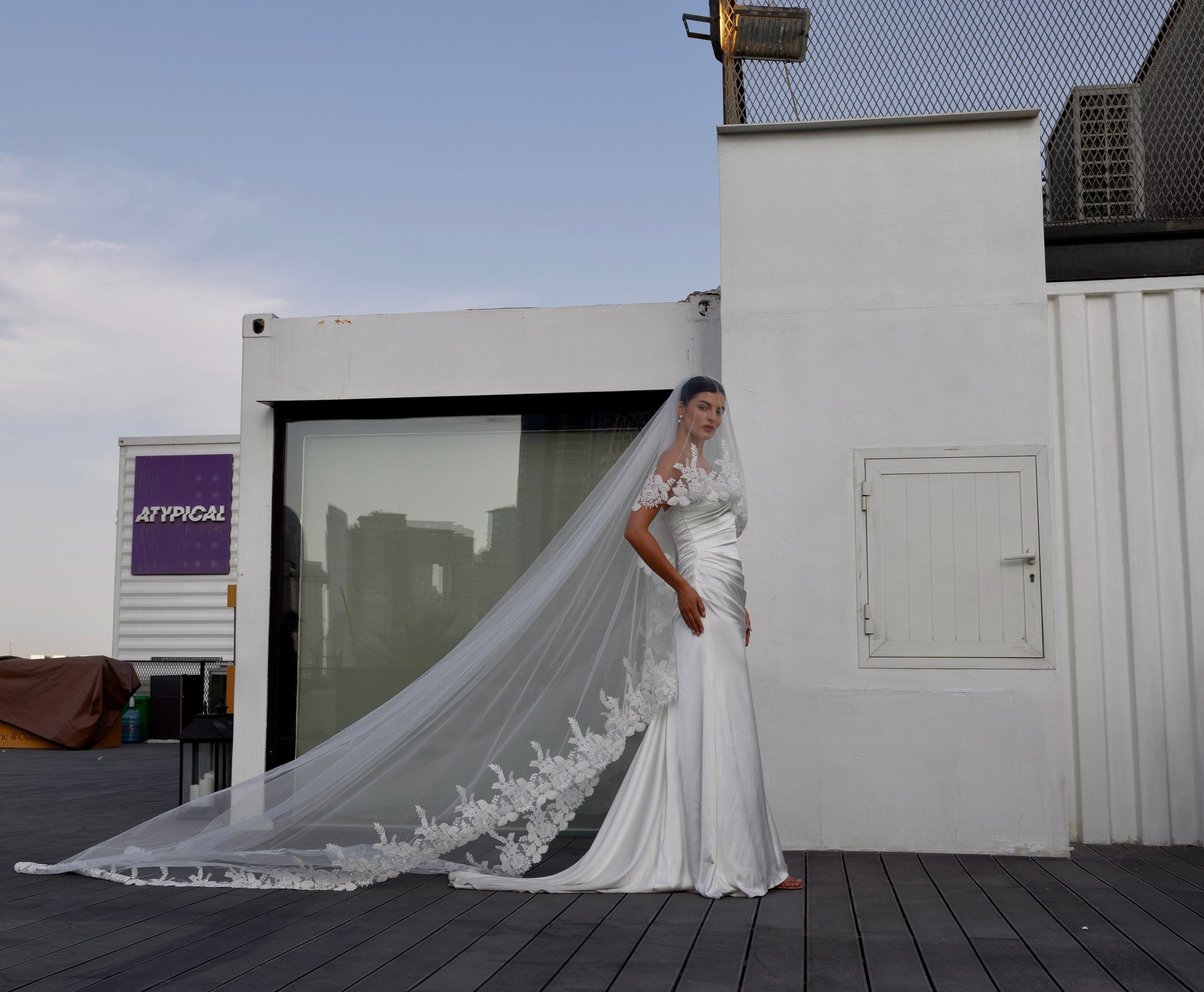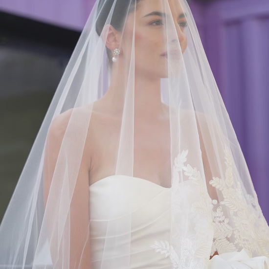 Elegant and ethereal, the Gaea Veil is a refined cathedral-length veil featuring a soft blusher and a sweeping trail, designed to embody the romance of a traditional bride. Adorned with intricately corded lace appliqué along the edges, this veil brings a sophisticated silhouette that flows seamlessly from ceremony to portraits.
