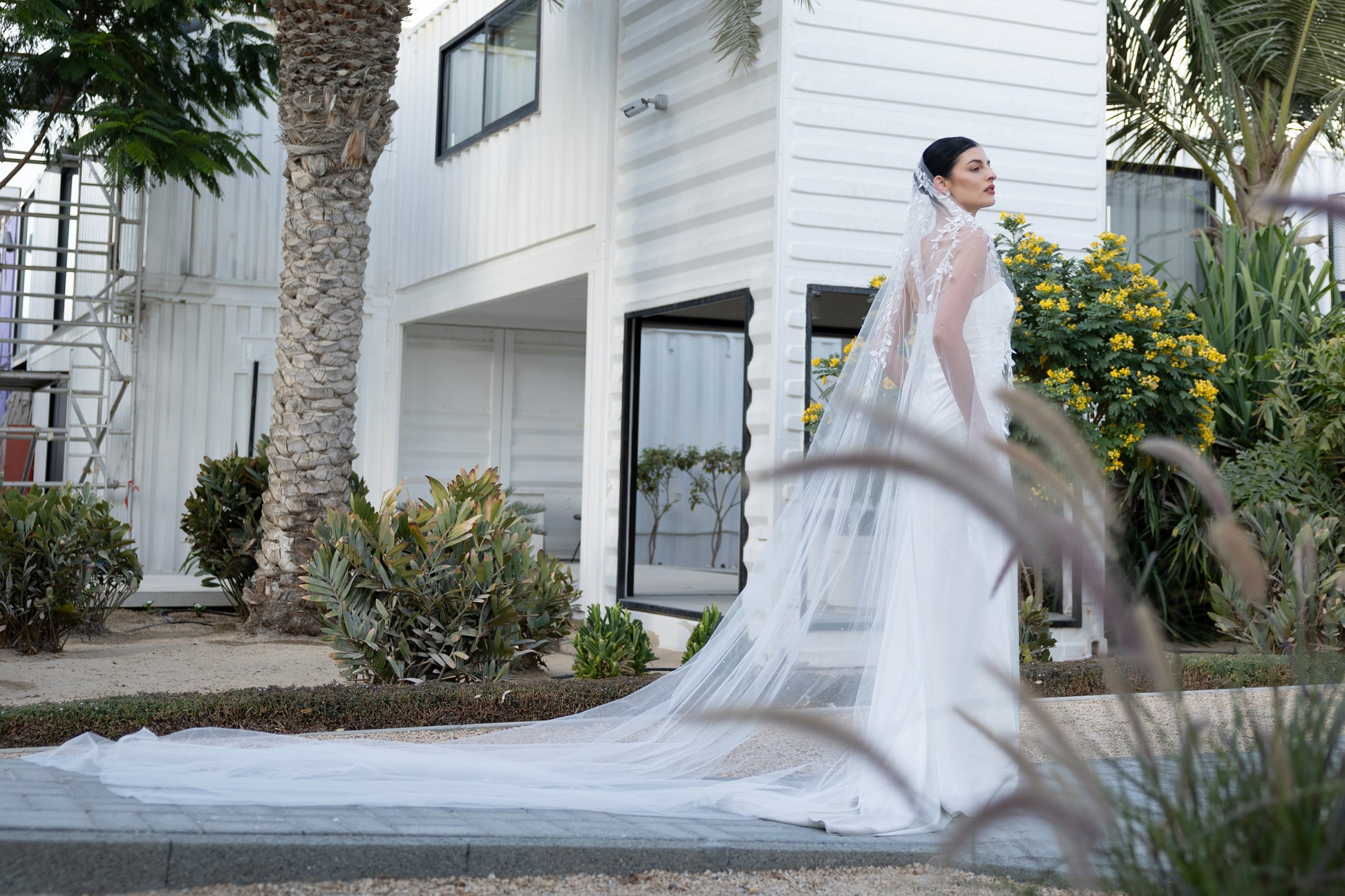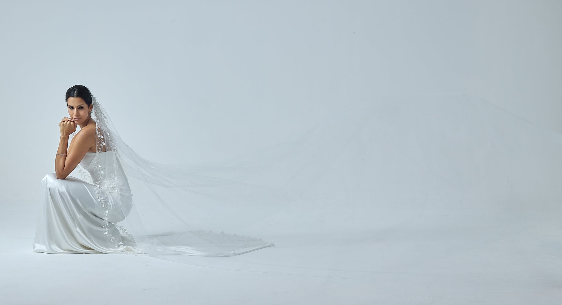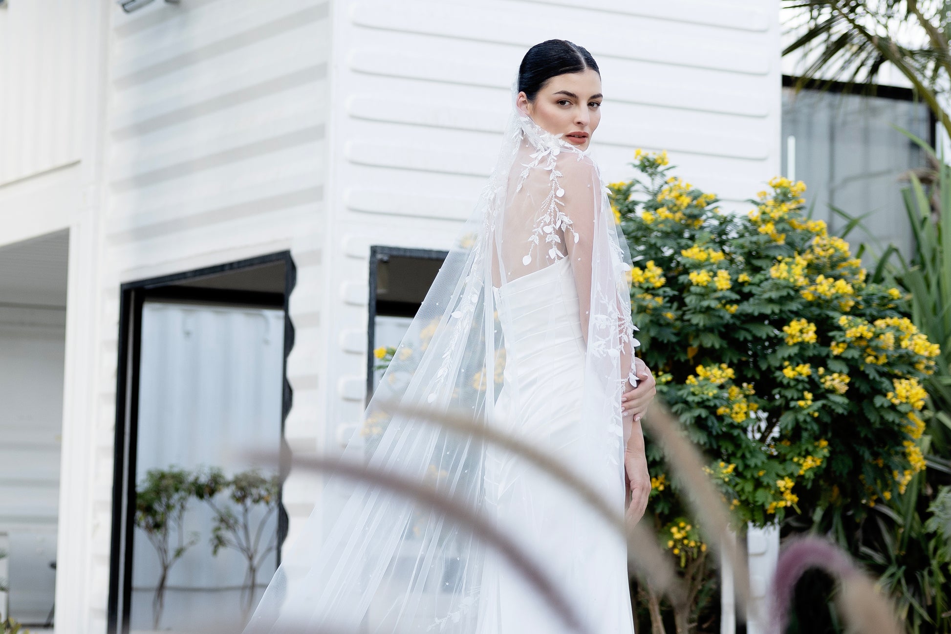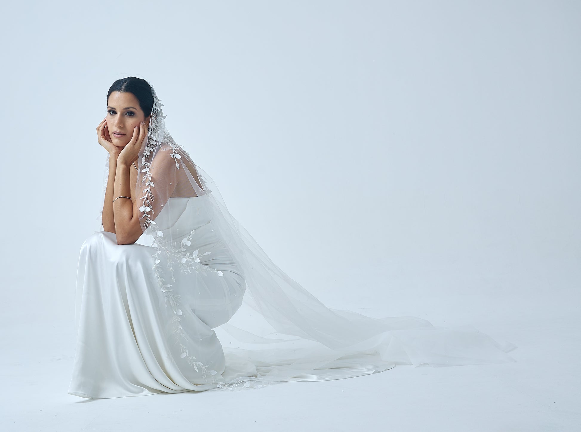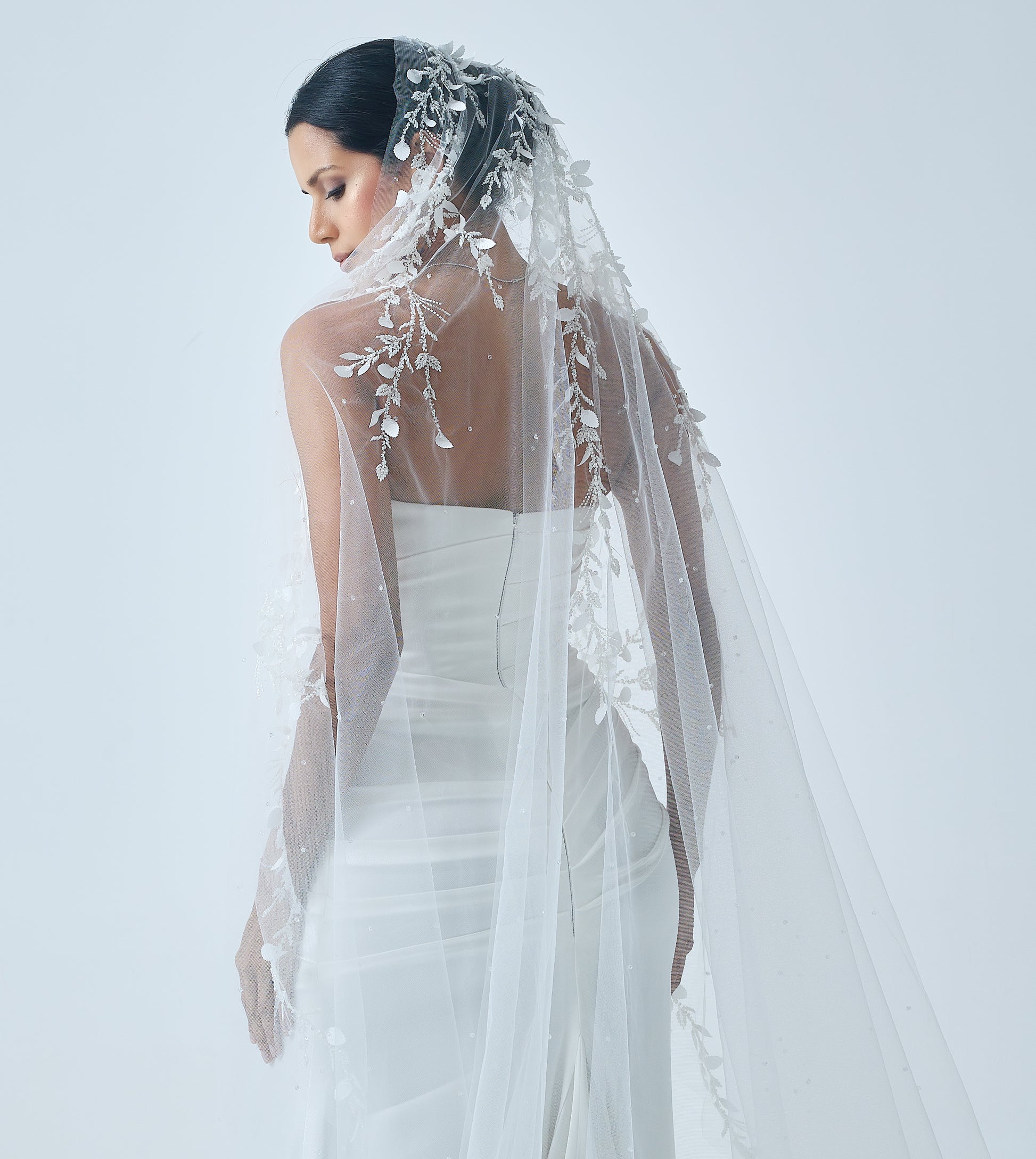 Inspired by climbing ivy and garden romance, this couture veil beautifully frames the bride while adding dimension and natural grace to the full bridal look.