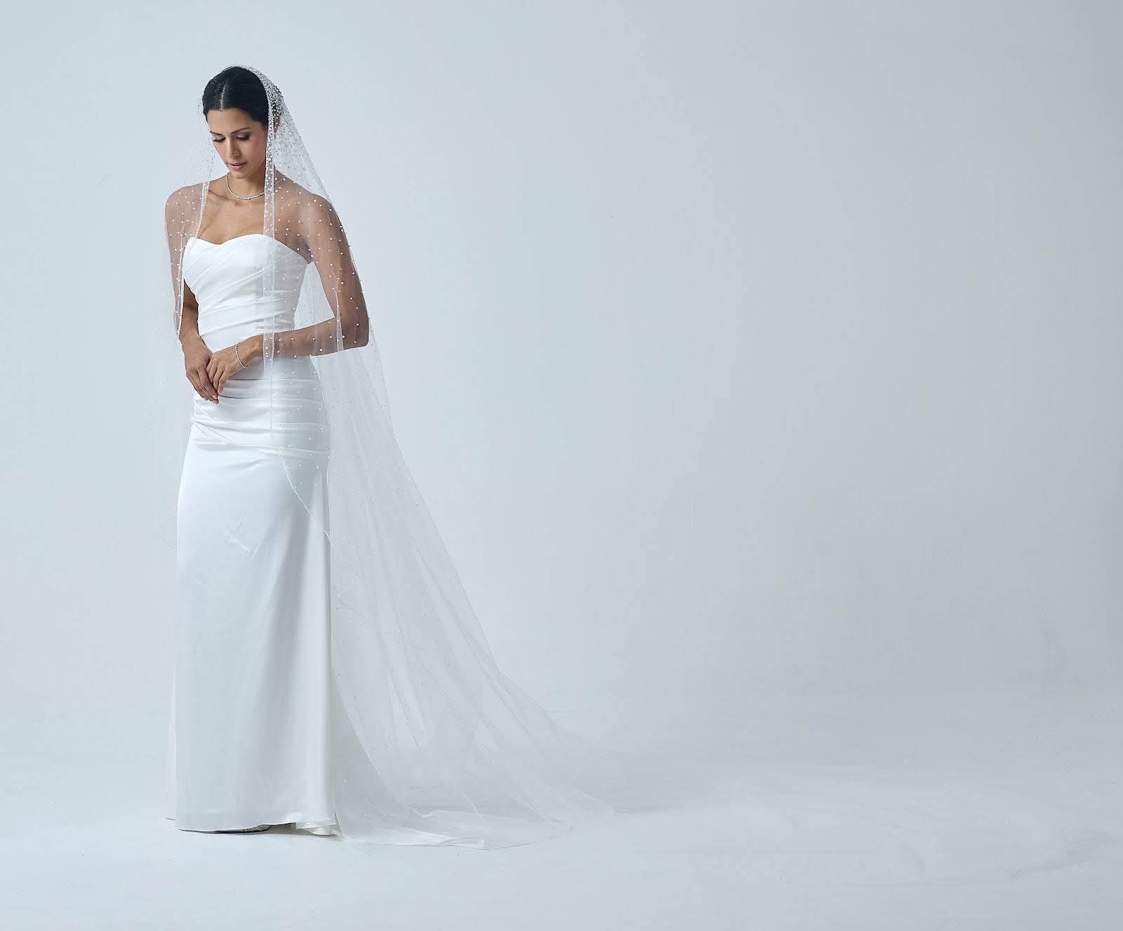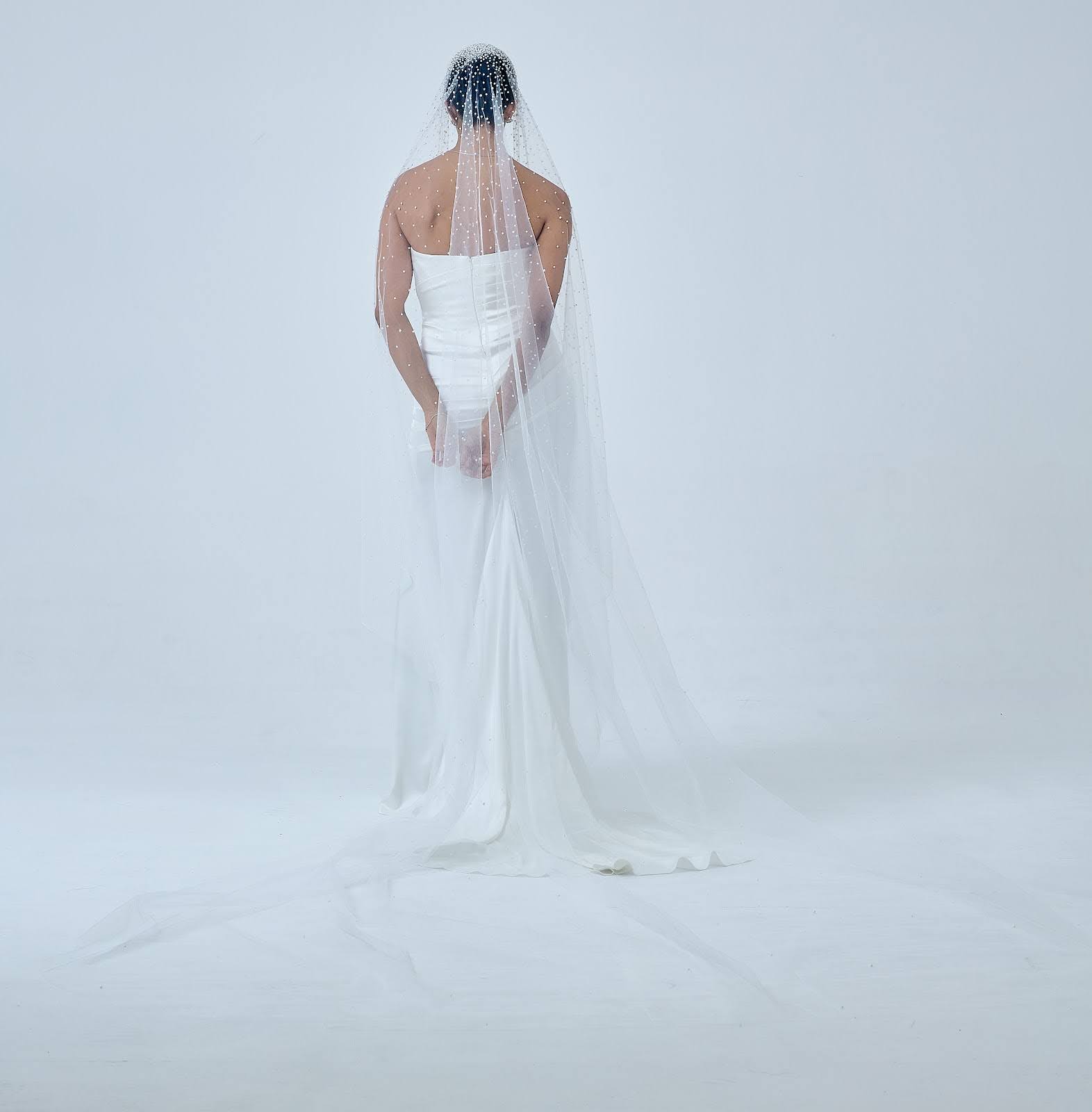This exquisitely hand-embroidered veil features delicate pearl and crystal bead embellishments that shimmer from the crown all the way to the flowing tail, creating a radiant, show-stopping finish. Designed for the modern bride with a love for classic elegance, Perla adds an ethereal touch to any wedding gown.