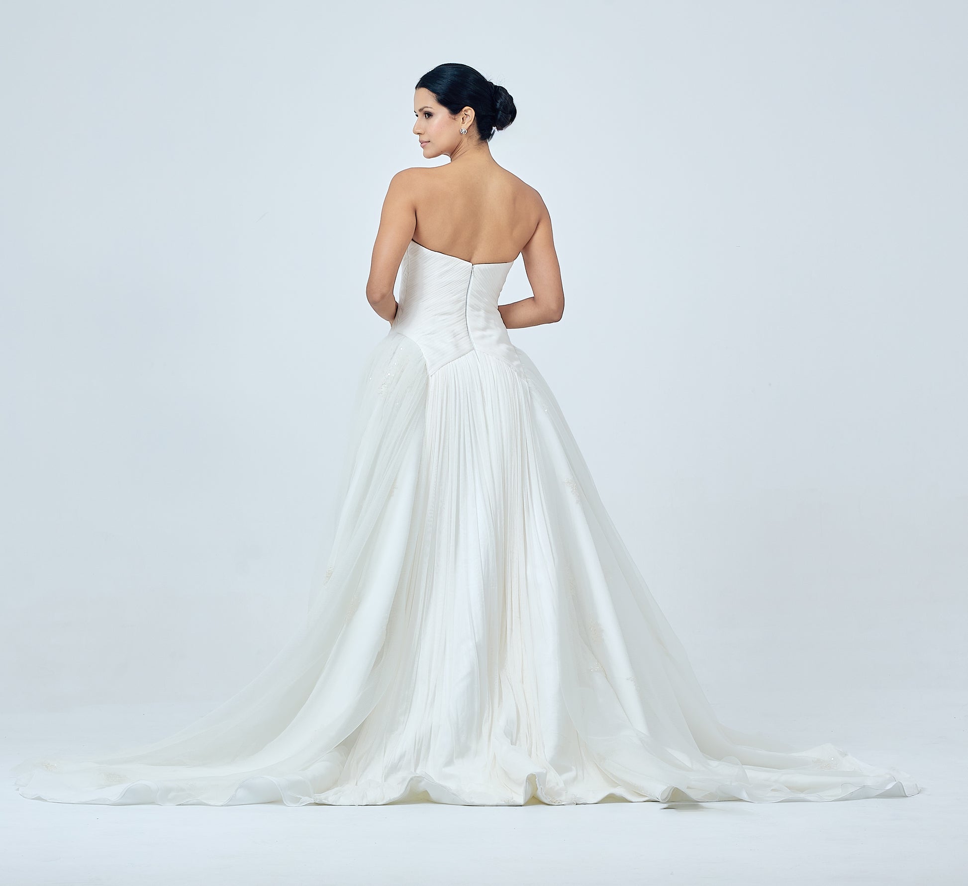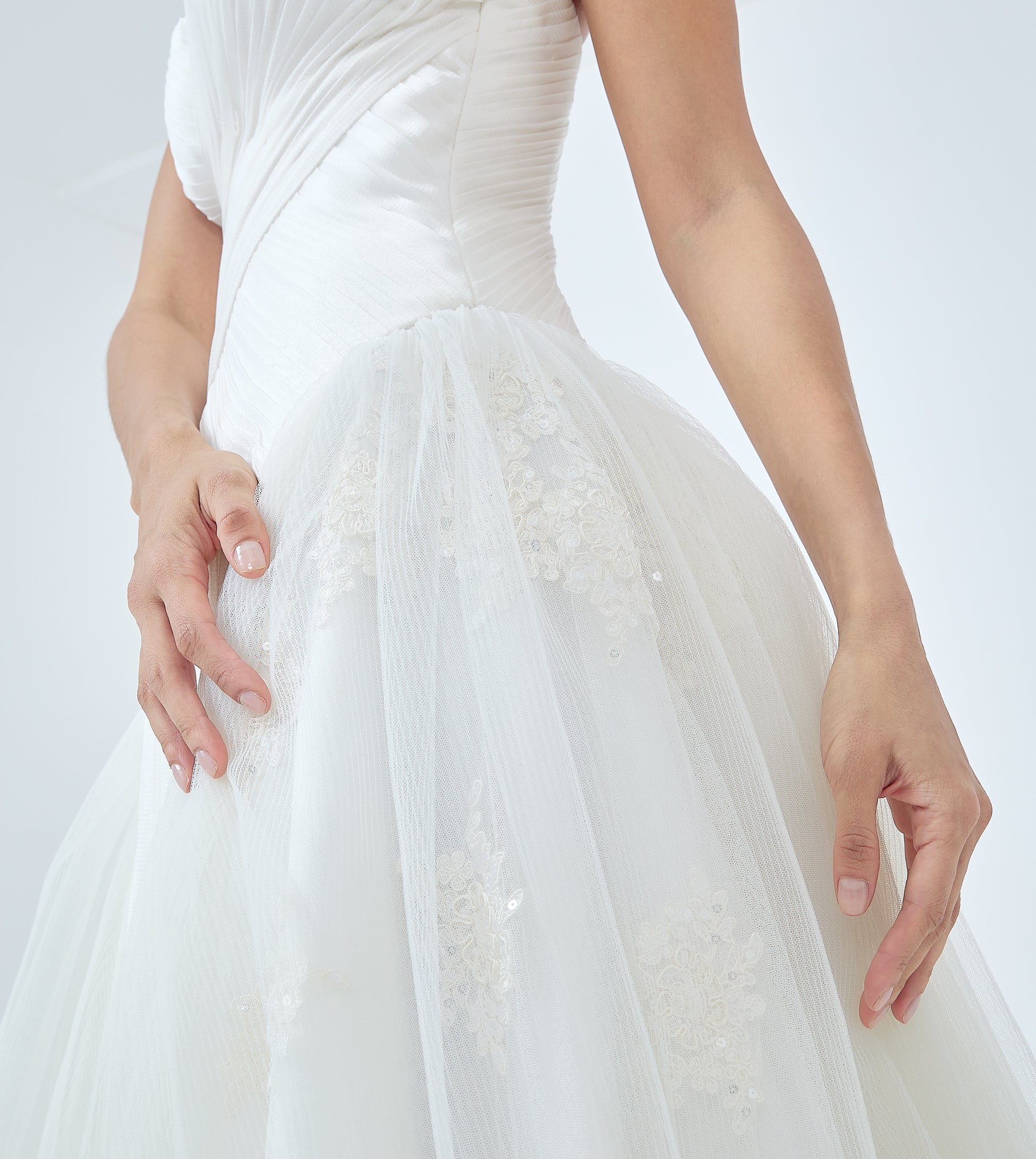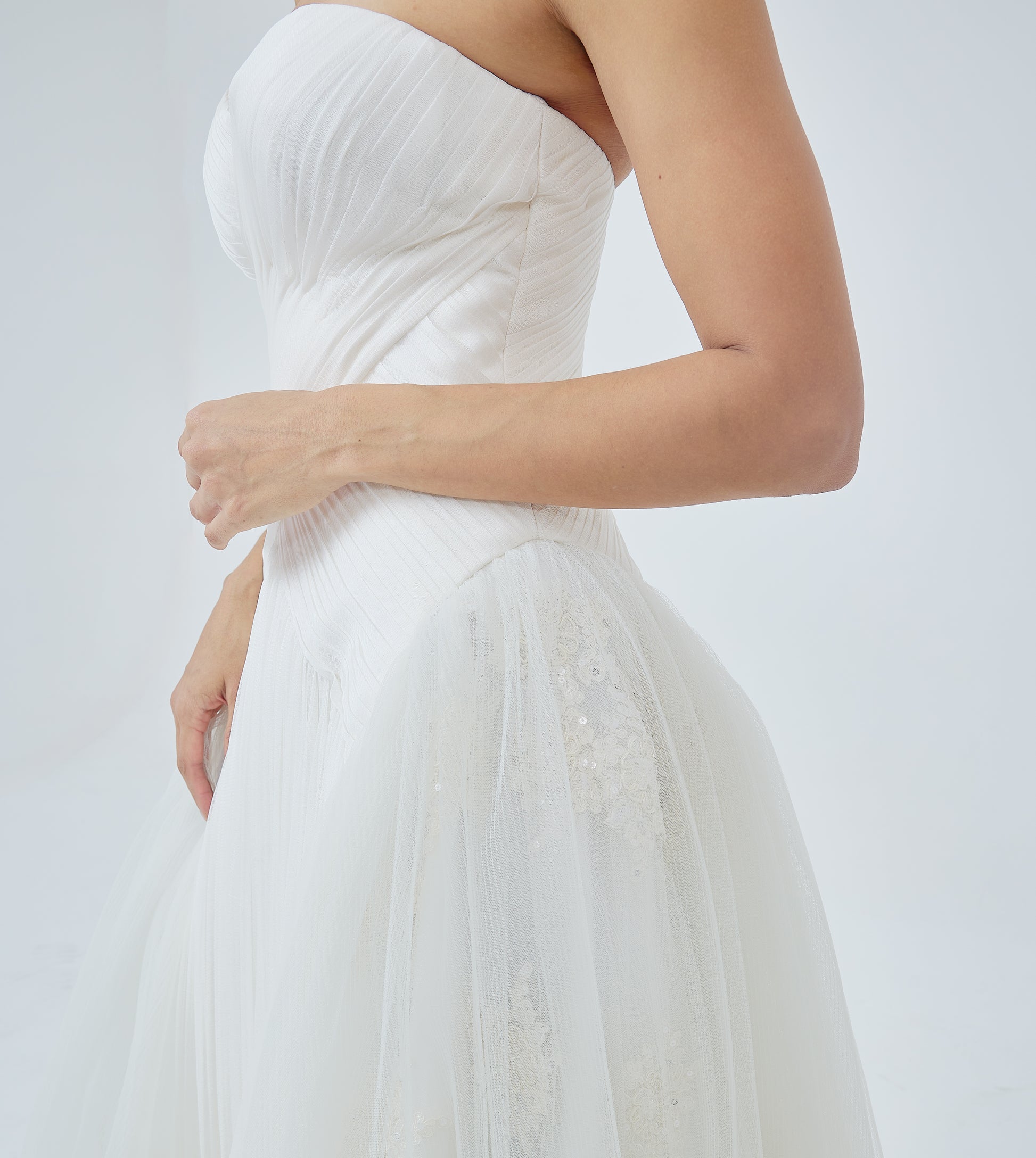 Crafted from cruelty-free silk tulle, this gown features artfully pleated tulle from the sides, subtly hinting at delicate lace embroidery. The dramatic train adds a touch of pure grandeur. A meticulously boned internal corset with lace detailing sculpts and accentuates your figure, while the invisible zip closure at the center back ensures a seamless finish.