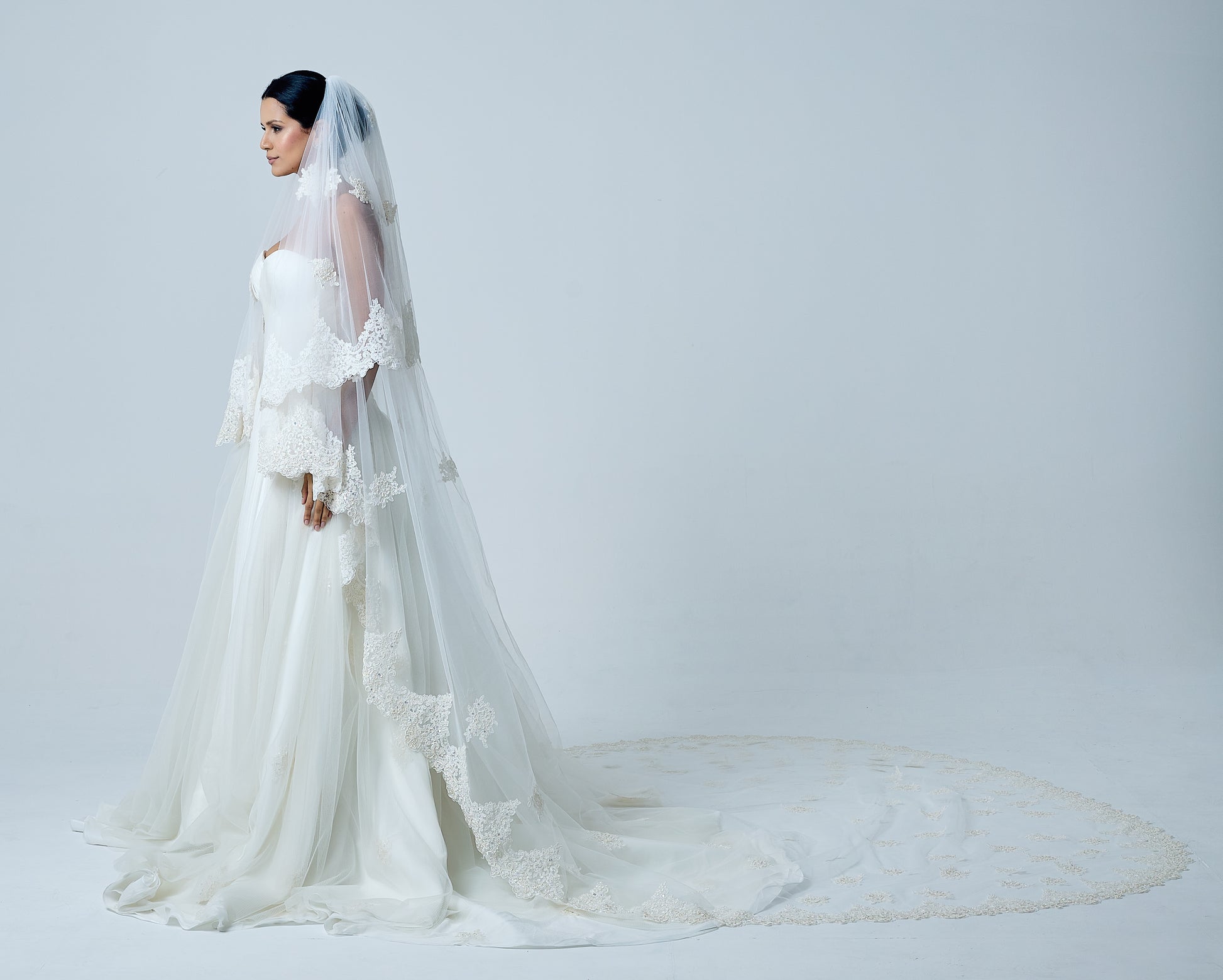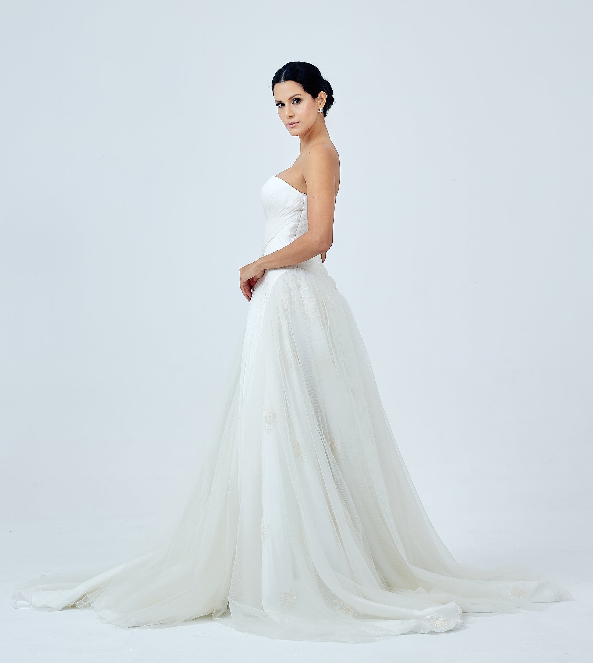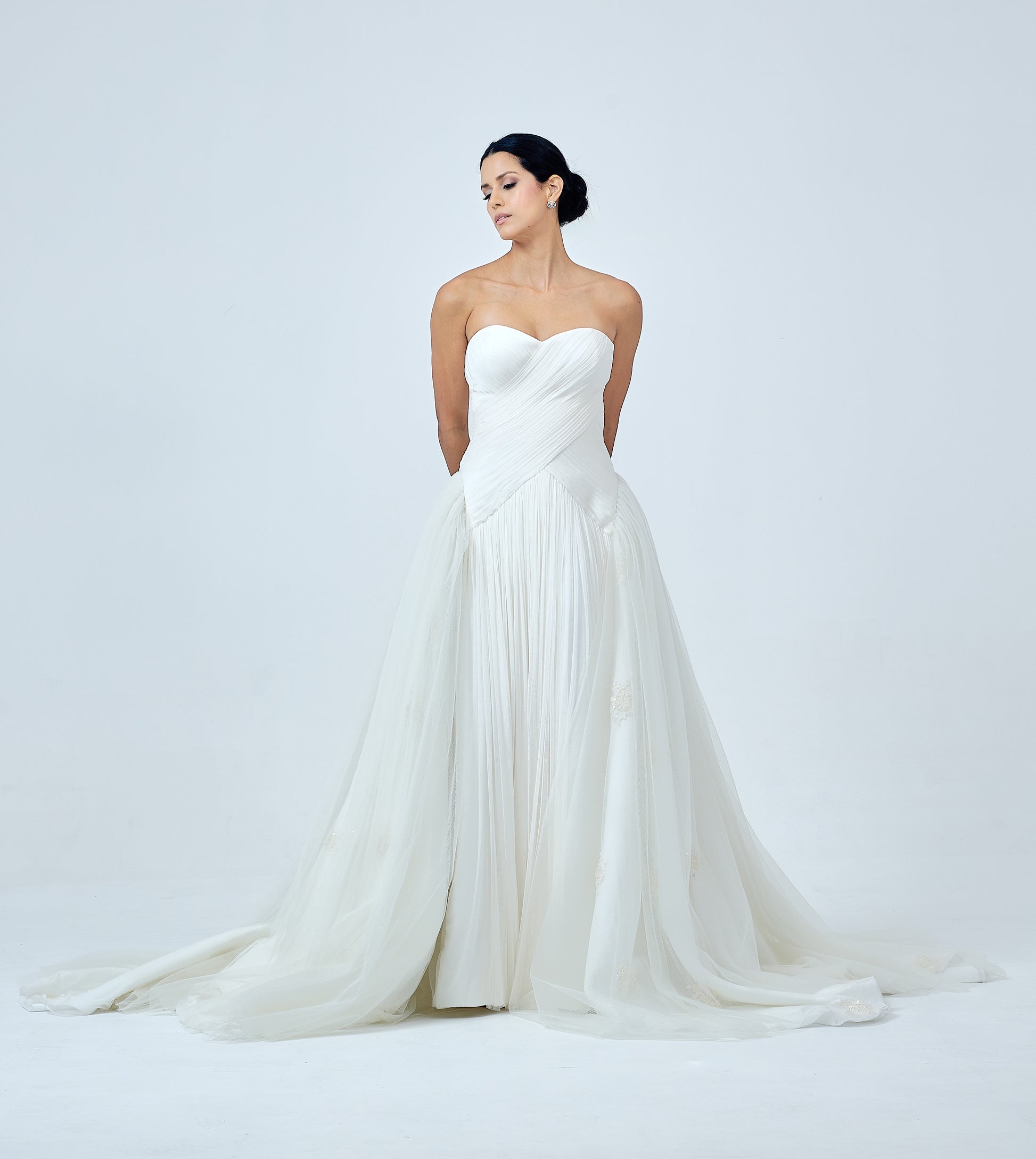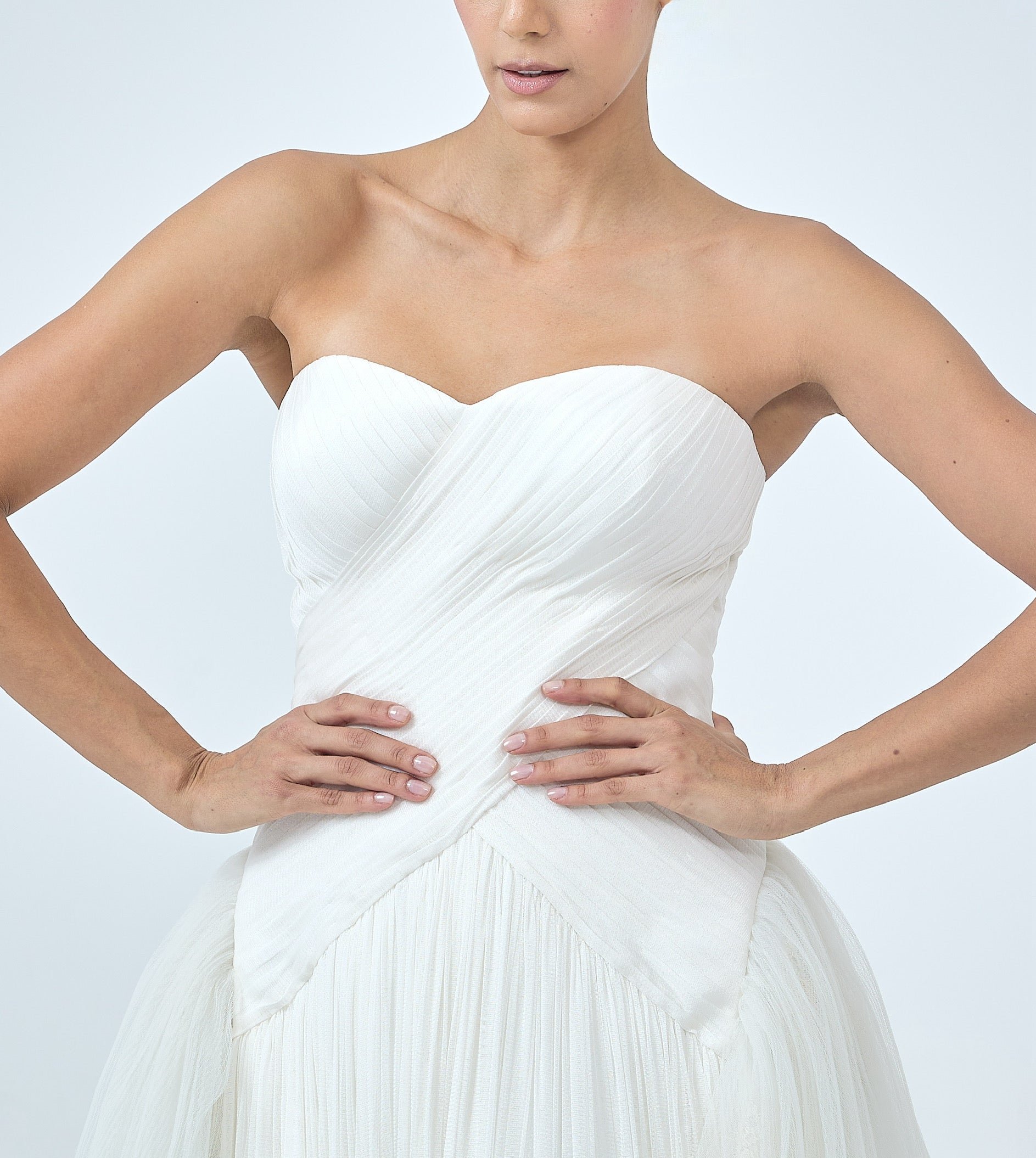 Crafted from cruelty-free silk tulle, this gown features artfully pleated tulle from the sides, subtly hinting at delicate lace embroidery. The dramatic train adds a touch of pure grandeur. A meticulously boned internal corset with lace detailing sculpts and accentuates your figure, while the invisible zip closure at the center back ensures a seamless finish.
